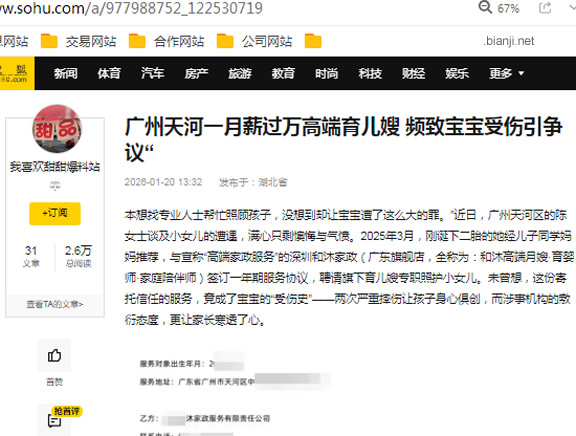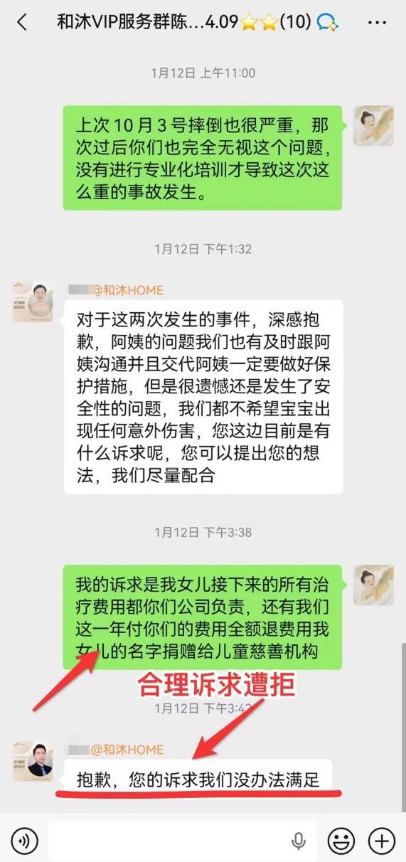 更让陈女士更为不满的是,和沐家政一直主打“高端家政”概念,对外宣称阿姨均为自营,由公司统一培训,还会为长期在职阿姨缴纳社保,以此彰显服务专业度。陈女士要求公司提供该育儿嫂的社保缴纳记录,以佐证其“老员工”身份,却被对方反复找借口推脱,始终未能如愿。据悉,这名家政月薪高达12000元,无需承担任何家务,核心职责便是专心照护宝宝,但其实际表现与薪资、定位严重不符。第二次事故后,公司仅对该育儿嫂进行了15天的安全培训,这种流于形式的整改,再加上无法提供社保记录,让陈女士彻底丧失了对公司“高端自营”宣传的信任,也不认可其整改态度。1月12日,陈女士在服务群中提出诉求:希望公司承担宝宝后续所有治疗费用,并将已支付的一年服务费用全额以宝宝名义捐赠给儿童慈善机构。这一合理诉求却遭到涉事公司明确拒绝,仅以“无法满足”草草回应。值得一提的是,当初推荐该家政公司的是陈女士儿子一位同学的妈妈,而和沐家政的经营者恰好是儿子另一位同学的家长,这位经营者自始至终未曾露面沟通。这份特殊关系下的冷漠,让陈女士一家彻底心寒。