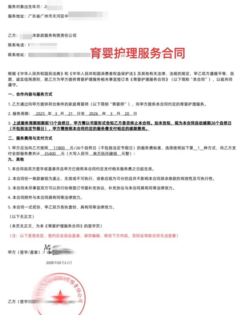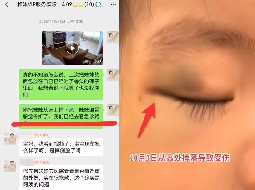 本想找专业人士帮忙照顾孩子,没想到却让宝宝遭了这么大的罪。”近日,广州天河区的陈女士谈及小女儿的遭遇,满心只剩懊悔与气愤。2025年3月,刚诞下二胎的她经儿子同学妈妈推荐,与宣称“高端家政服务”的深圳和沐家政(广东旗舰店,全称为:和沐高端月嫂·育婴师·家庭陪伴师)签订一年期服务协议,聘请旗下育儿嫂专职照护小女儿。未曾想,这份寄托信任的服务,竟成了宝宝的“受伤史”——两次严重摔伤让孩子身心俱创,而涉事机构的敷衍态度,更让家长寒透了心。