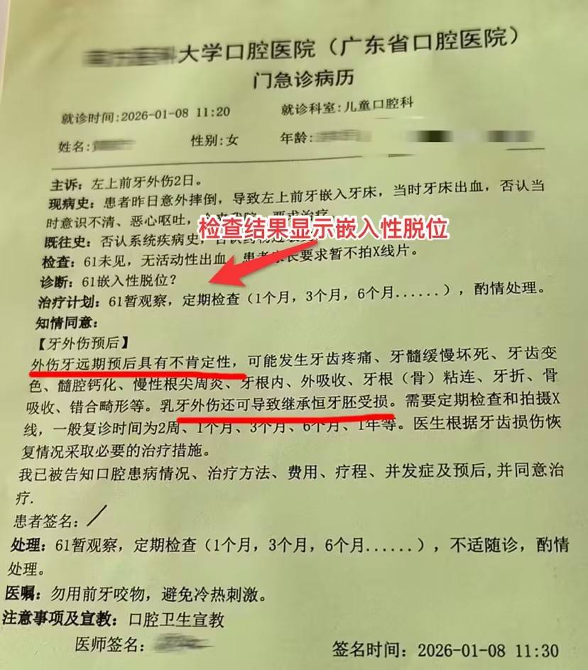 悲剧在2026年1月8日再度上演。当时刚学会走路的宝宝,在育儿嫂照看下咬着保温杯行走,育儿嫂未及时劝阻这一危险行为,反而用手遮挡宝宝,导致其重心不稳重重摔落。此次摔伤造成宝宝左上前牙嵌入牙龈,目前仍无法看清牙齿具体损伤情况。医院诊断记录显示,宝宝牙齿为嵌入性脱位,需定期复查至恒牙萌出,期间可能出现牙髓坏死、牙齿变色、根尖周炎等后遗症,甚至可能影响继承恒牙胚发育。