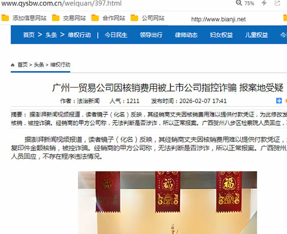 据澎湃新闻视频报道,读者镜子(化名)反映,其经销商丈夫因核销费用难以提供付款凭证,为此修改发票复印件金额核销,被控诈骗。经销商的甲方公司称,无法判断是否涉诈,所以正常报案。广西贺州八步区检察院人员回应,不存在程序违法情况。